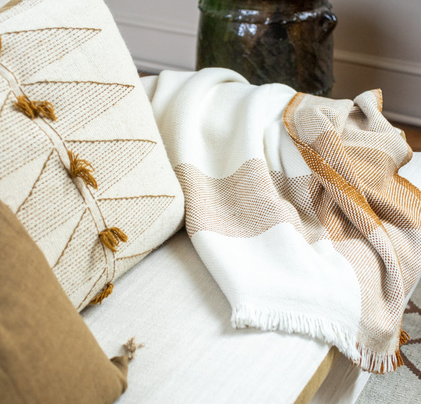 Avec sa palette de couleurs brutes, sa texture rythmée par des bandes sari, sa finition frangée et son tissage en matières 100% naturelles, il évoque le sentier des ocres. Inspiré du mot hindi dhara signifiant "terre", il invite à la douceur. Ses motifs géométriques, sobres et captivants, trouvent leur place dans chaque décor : pour habiller un canapé ou accompagner vos soirées fraîches.