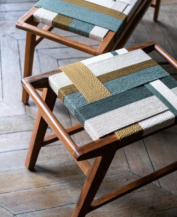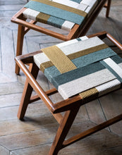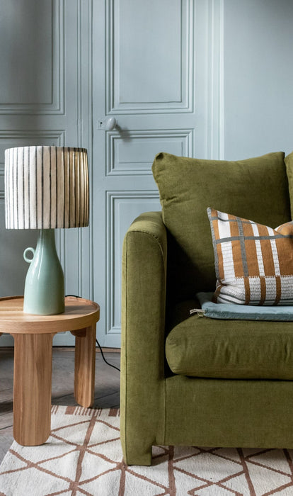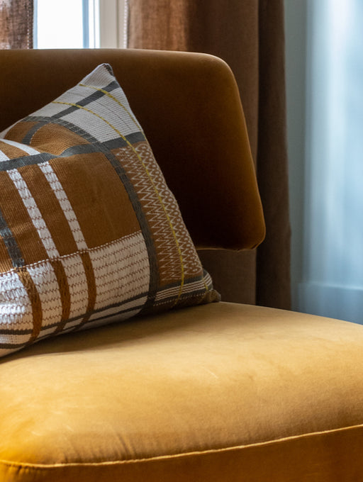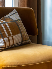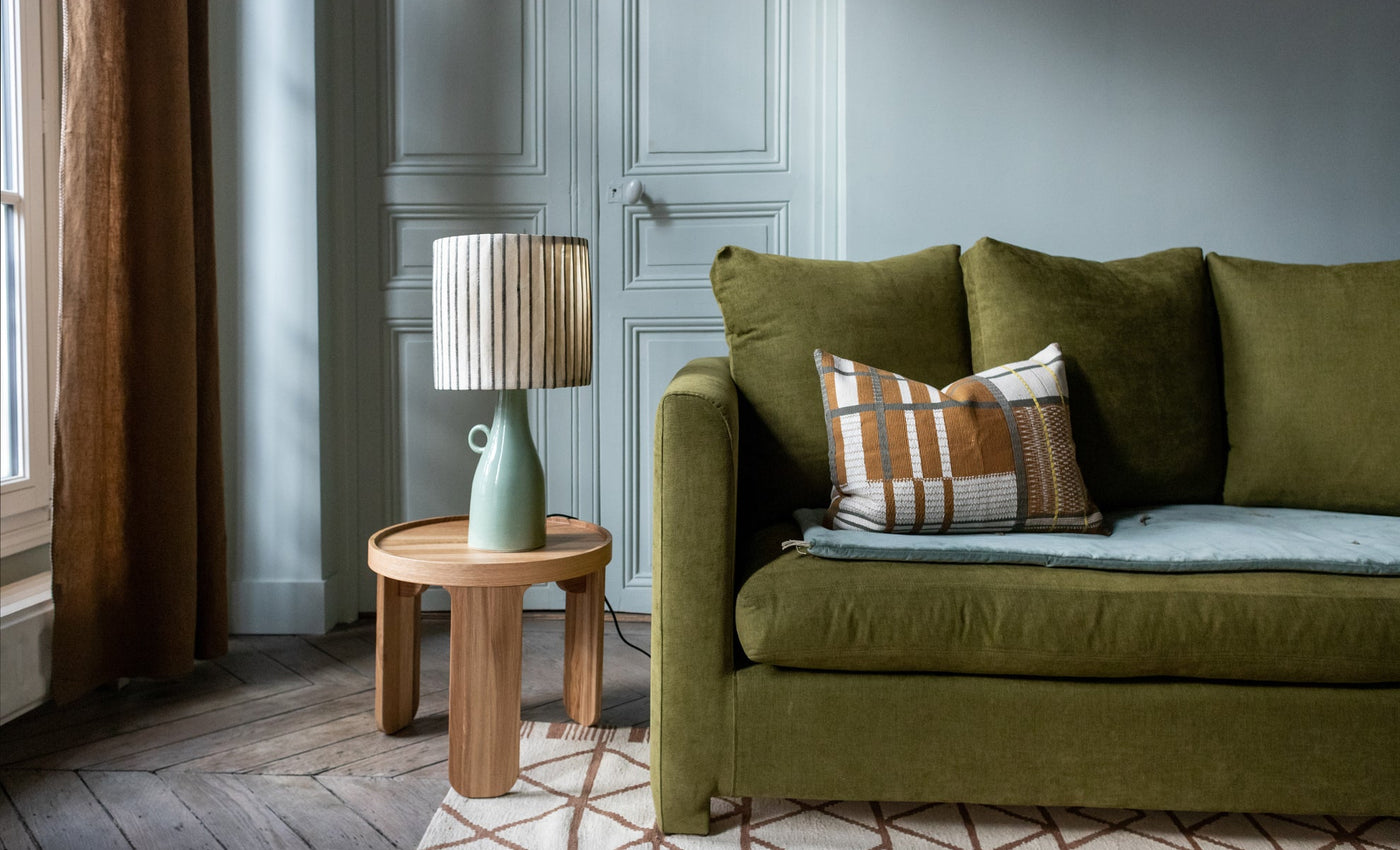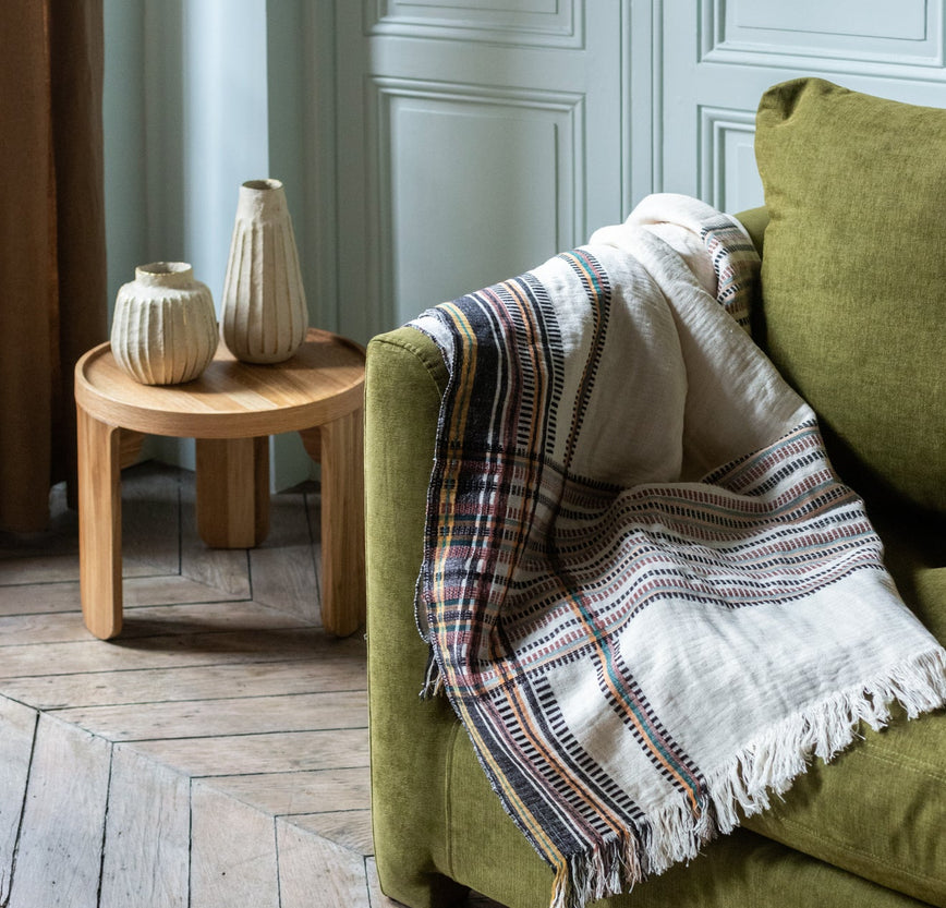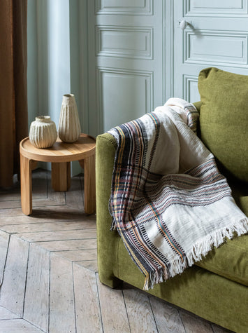 Sur l'assise tressée d'un banc ou d'un tabouret, sur un plaid en lin enveloppant, sur des coussins aux motifs géométriques. Ces housses sont nées d'un métier à tisser artisanal à la ceinture - un outil rare, un savoir-faire qui perdure avec nos artisans. )