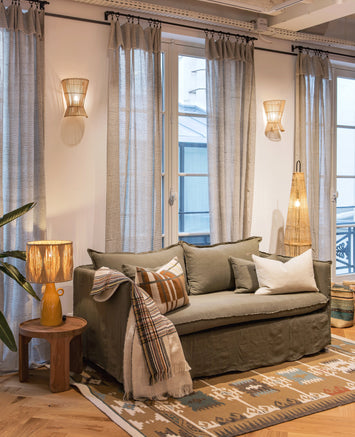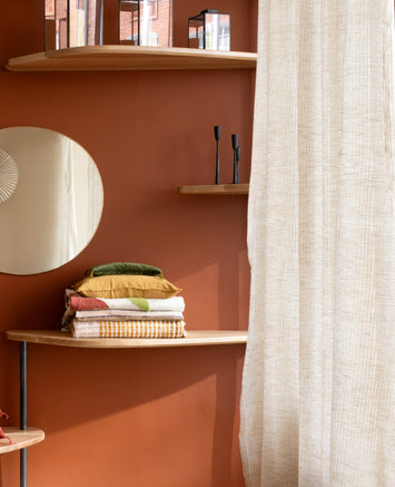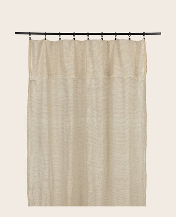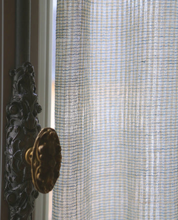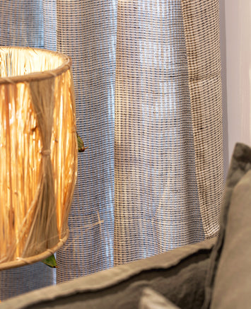 Le rideau Arys, en khadi de coton biologique, est filé et tissé à la main dans un atelier du Madhya Pradesh, en Inde. Teint avec des colorants naturels (charcoal ou havane), chaque fil est travaillé avec soin par des tisserandes, apportant un savoir-faire artisanal d'une grande finesse.
