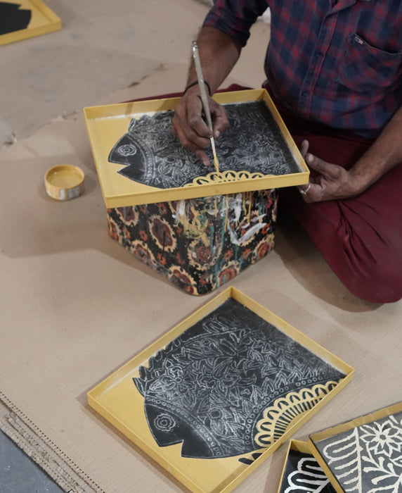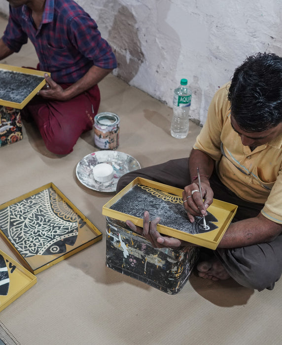 Des couleurs qu’on n’oublie pas, et le savoir-faire unique de l’artisanat indien : chaque plateau Madhu contient en lui-même son propre récit. Son iconique bestiaire marin se réinvente dans chacune de ses déclinaisons sous le pinceau d’un artisan.