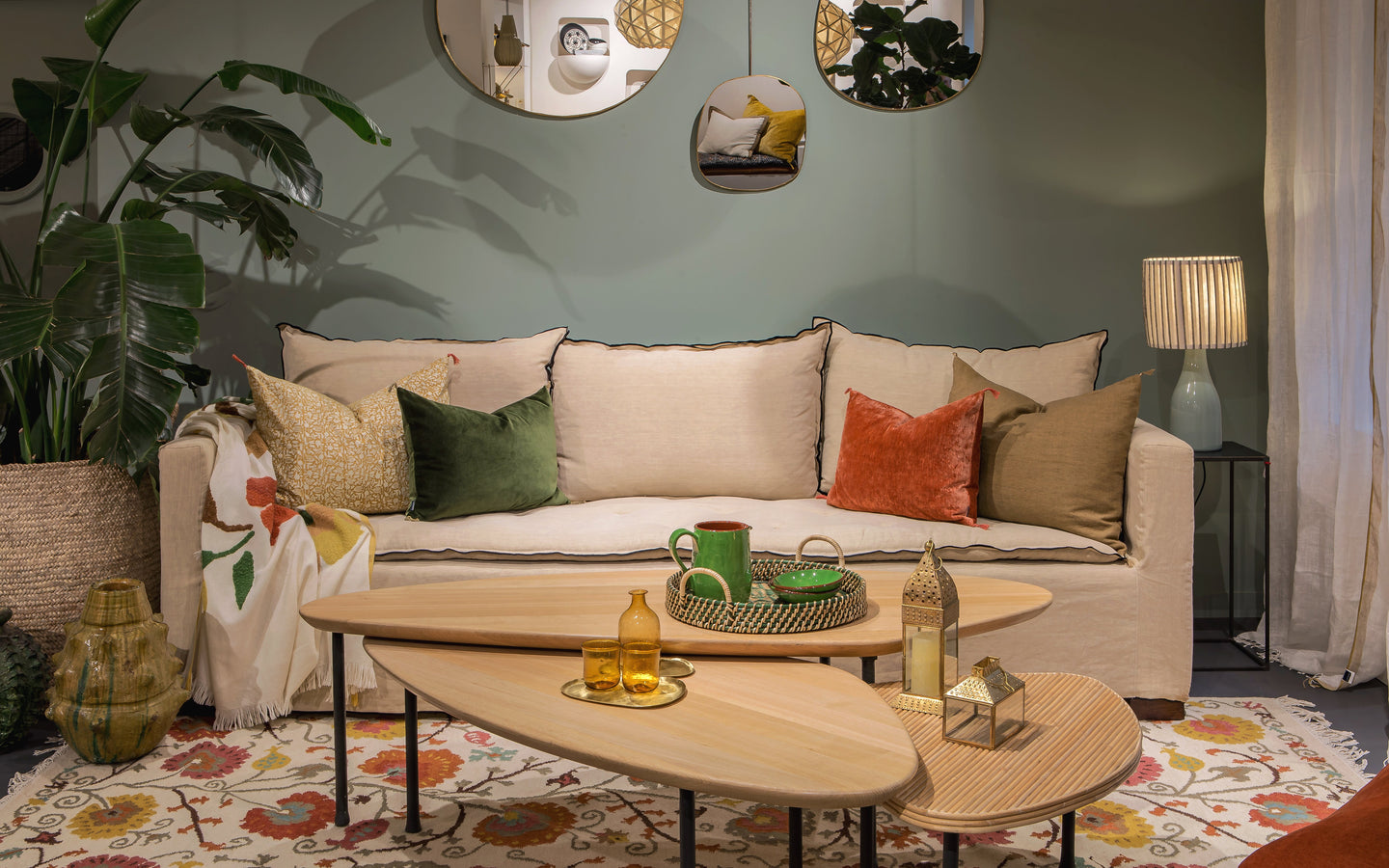 De grosses fleurs colorées étalent leurs pétales sur le fond crème Nipa, comme un herbier imaginaire qui aurait fait fleurir la laine.