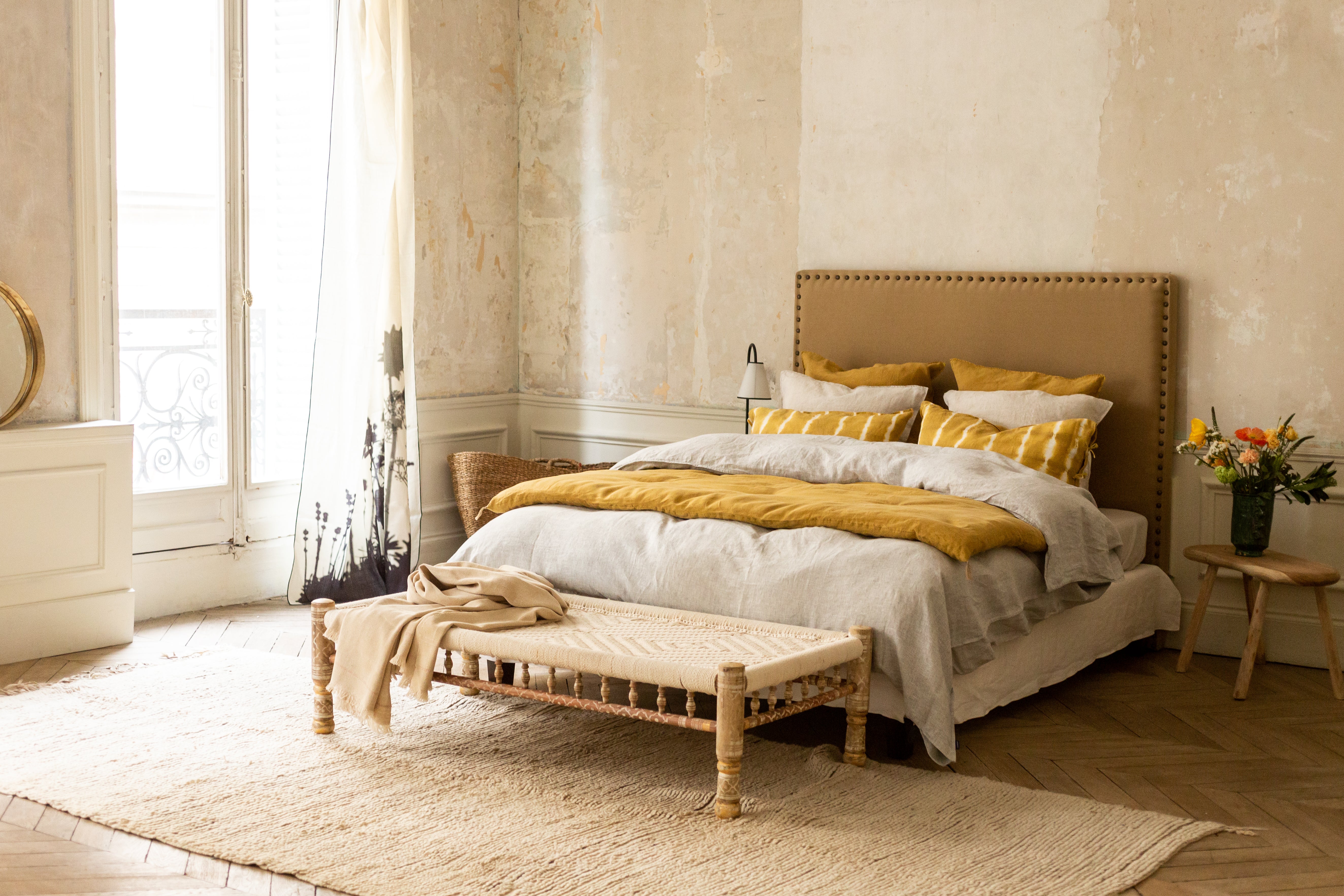 Réside dans l’excellence de son procédé de fabrication. La fibre de lin, noble et naturelle, est récoltée et tissée en Europe. Le tissu est ensuite teint, lavé et adouci, pour lui apporter cette texture délicatement froissée, si voluptueuse. La teinture sur pièce intervient dans un second temps et sur commande, dans notre atelier français : un bain de couleur est savamment préparé, la pièce de lin lavé y est délicatement plongée et s’imprègne doucement de chaque nuance. Les teintures se révèlent au contact de la fibre et offrent un rendu magique : les couleurs vibrent en profondeur. Chaque parure est ensuite minutieusement étudiée par nos soins, afin de s’assurer que la teinte est harmonieuse, même si chacune reste unique et révèle ses propres vibrations.