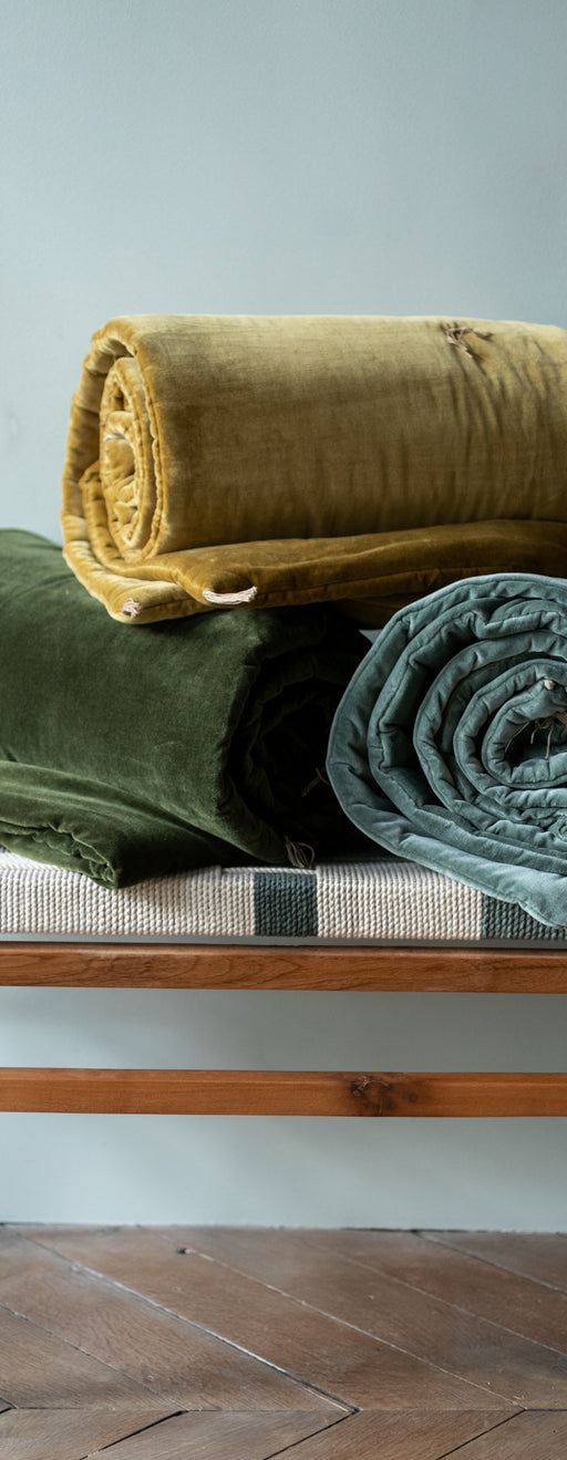 Les sofa covers de Caravane : une envolée sur l’échelle du douillet, qui s’acclimate à toutes les saisons. Au-delà du coton imprimé, ils se retrouvent en velours lavé et coton, ou en velours lavé. Comme leur version en coton, ils jouent la carte du confort. En bi-matière, coton doublé de velours, ils offrent une douceur supplémentaire qui se prête si bien aux journées d’automne, ou aux soirées d’hiver. Réversibles, ils s'invitent à des moments de cocooning où le temps n'existe plus. En velours lavé, ils jouent à fond la carte de la douceur. La caresse du velours comme un nuage de chaleur, l’intensité de couleurs unies comme un rappel de couleur ou une affirmation.
